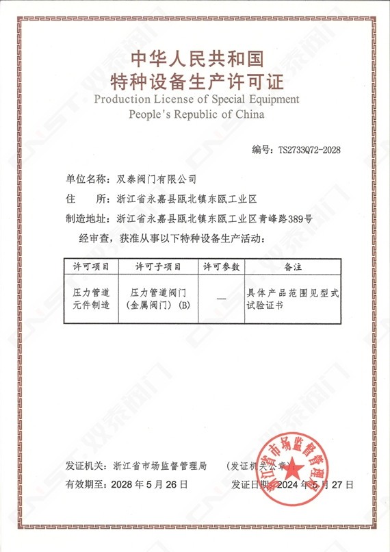 金屬閥門特種設備生產許可證